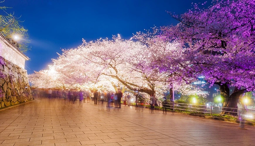 ③ 夜间点灯时,粉色樱花在灯光映照下充满神秘浪漫的气息。