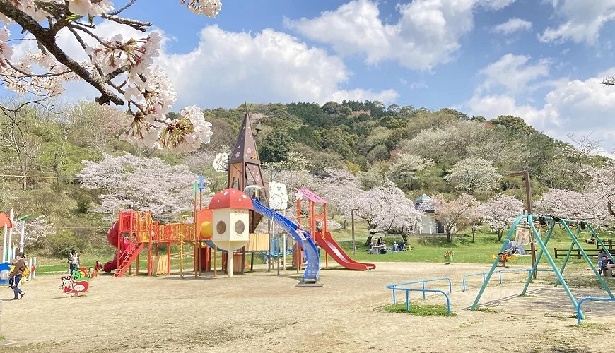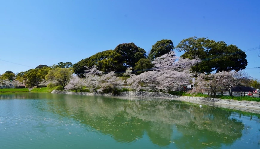 甘木公园又称「丸山公园」,是朝仓市最知名的赏樱景点。园内以葫芦形的「丸山池」为中心,种植了约4,000棵樱花树,规模相当惊人。樱花盛开时,整座公园会被染成一片淡粉色,倒映在宽阔平静的湖面上,景色绝美壮丽。公园腹地广大,还有草坪广场与游乐器材,非常适合全家大小带着便当来此野餐。夜间点灯时倒映在湖水中的樱花景色,更别有一番幽静风情。