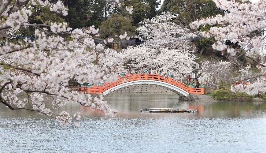 福冈最具人气的观光地「太宰府天满宫」以梅花最为知名,但春天的樱花景色同样令人陶醉。分布在心字池周边及通往本殿的古老建筑旁的樱花树,酝酿出神社特有的雅致风情。特别是当樱花瓣飘落在心字池的水面上,与朱红色的太鼓桥相映成趣,形成充满浓厚日式美学的景致。来到这边可以参拜学问之神菅原道真,并在充满历史与美感的境内漫步赏樱,是非常推荐给文青族群的赏樱景点。