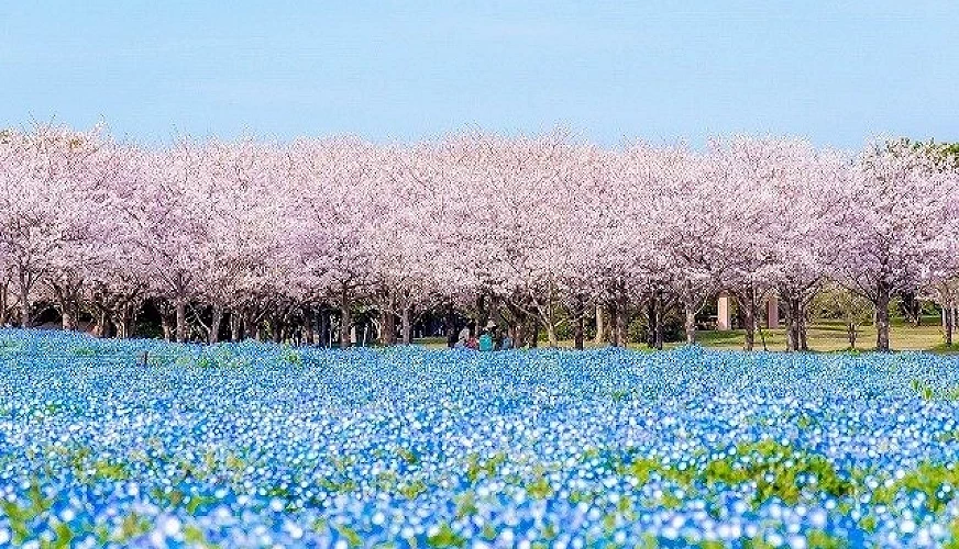 ① 「粉红樱花」与「蓝色粉蝶花」同时绽放的罕见绝景。