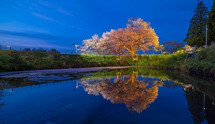 位于久留米市的「浅井一本樱」是一棵树龄约110年的巨大山樱花,树干周长4.3公尺,高度达18公尺。这棵孤高的百年樱花树傲然矗立在水池边,满开时桃红花朵与倒映在水池中的「逆樱」相互辉映,形成完美的对称美景。许多摄影师会在每年仅短短几天的盛开期,专程前往捕捉其令人屏息的庄严姿态。