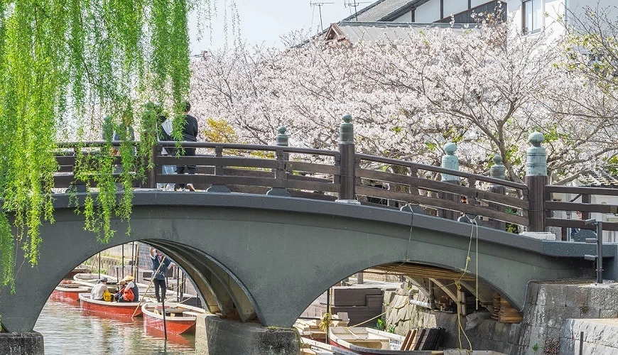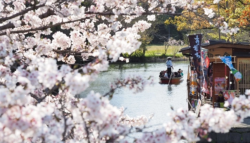 有「水乡」之称的柳川市,以乘船游览护城河的「游河(川下り)」闻名。春季时,护城河两岸的樱花盛开,游客可以穿上和服搭乘小舟,在船夫吟唱的传统歌谣声中,缓缓穿过低垂的樱花枝头。粉色的花瓣飘落在水面上,与两岸随风摇曳的柳树形成诗情画意的对比。这种从水面上仰望樱花的独特视角,是只有在柳川才能体验到的风雅韵味。