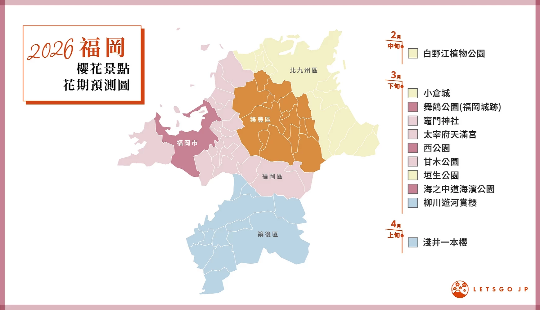 2026年最新福冈赏樱攻略飒爽登场!严选小仓城、舞鹤公园、海之中道等11大人气景点,看粉蝶花、海景、神社、城市景观与樱花共演。本文整理了最新开花预测、赏樱地图与一日游行程,带大家轻松体验春日浪漫的福冈!