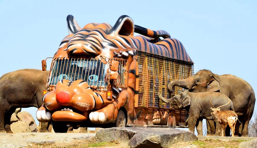 在「九州自然动物园」最高潮迭起的体验,就是搭乘动物造型的「丛林巴士(Jungle Bus)」前往野生动物区,亲手喂食野生动物!每台车可以乘载27名游客,座椅均朝外的设计,方便见到在野生动物区的动物们,外部附有坚固的栅栏,可以打开小窗,用长夹夹饲料喂食野生动物哦!