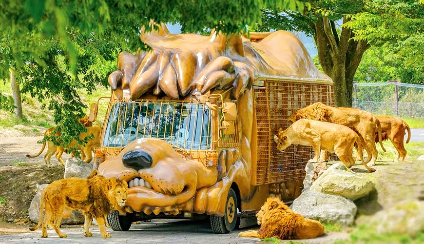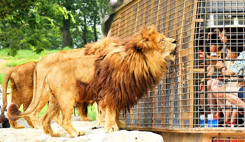 「丛林巴士」绕行一圈约需1小时,会依照顺序经过黑熊与高山动物区、狮子区、草食动物区、老虎区、猎豹区、羚羊区。经验丰富的司机会停在动物聚集的点上,方便大家喂食,盆中的饲料也分成肉食及草食,记得不要喂错哦!坐在巴士内,即可感受到野生动物区中动物与车子交错的奇妙视觉经验。