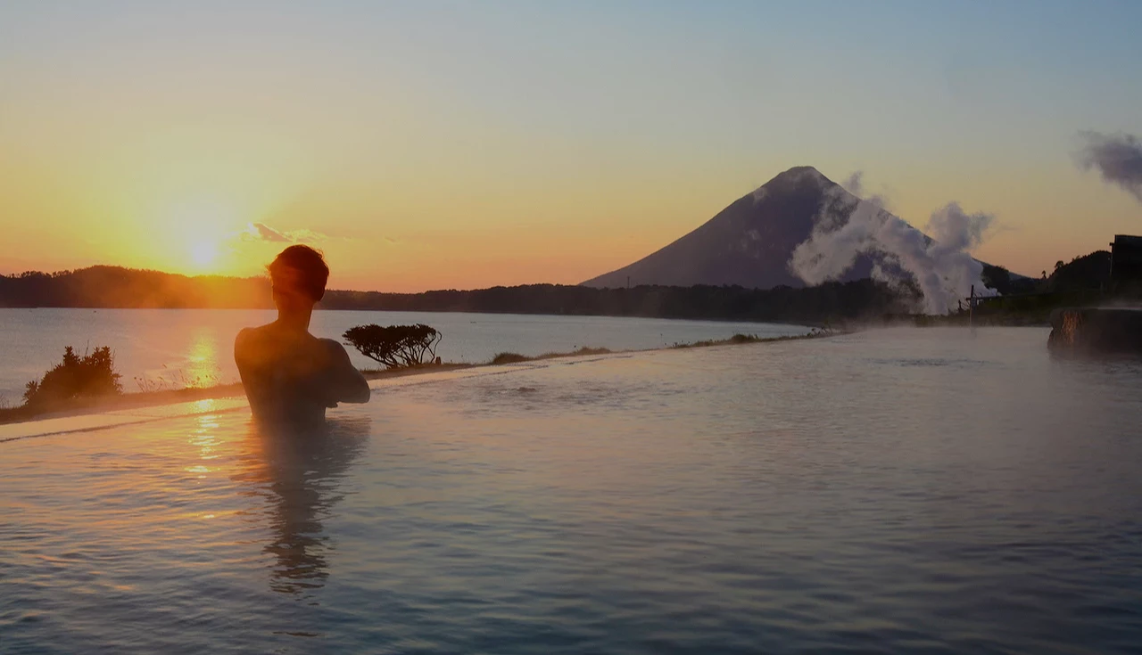在砂蒸温泉隔壁就是指宿知名的露天风吕「玉手箱温泉」。这里连续四年荣获旅游网站Tripadvisor「日本第一名露天风吕」的殊荣,拥有和风与洋风两种浴池。泡在温泉中,眼前就是有着「萨摩富士」之称的开闻岳与锦江湾海景,夕阳洒落水面时,更是美得令人屏息。