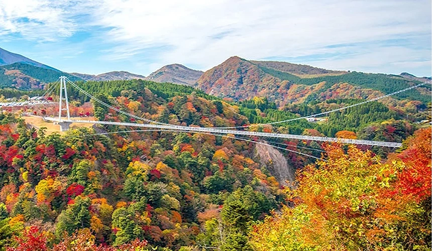 九重梦大吊桥位于大分县九重町,是日本最高、最长级别的人行专用吊桥之一,全长390公尺、桥面高度达173公尺,可俯瞰震动瀑布和雄伟的九重连山景色,四季皆展现不同风貌,特别是秋季红叶最受欢迎。周边规划完善,设有步道、展望台、登山路线以及露营区,能轻松结合健行、赏景与户外活动,是喜欢自然风光旅人的必访景点。
